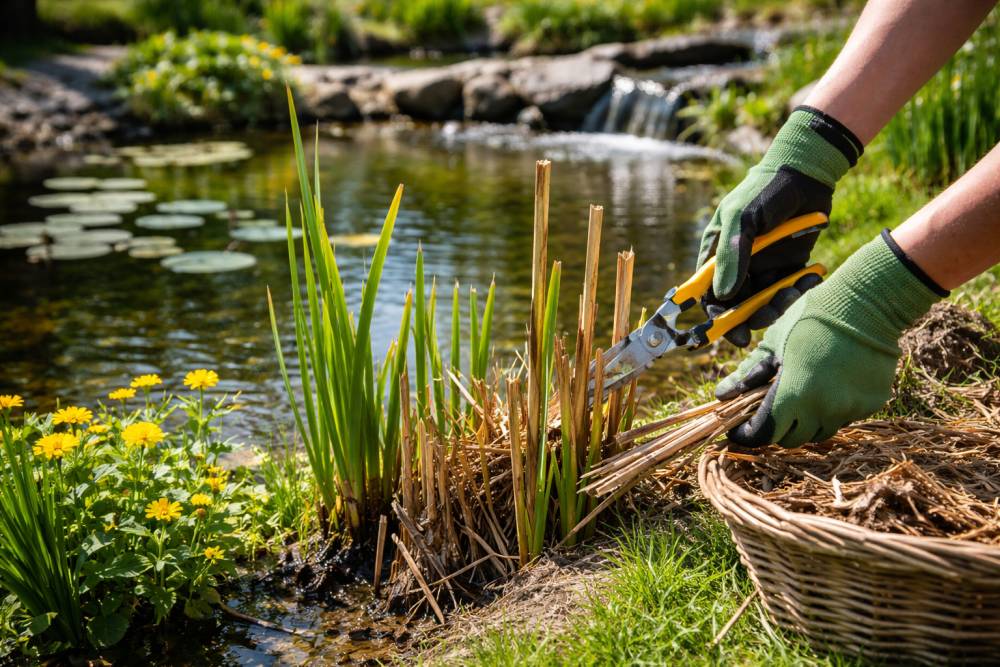 Blätter, Blütenreste, abgestorbene Pflanzenteile und Fadenalgen sollten regelmäßig entfernt werden. Besonders im Frühjahr ist das entscheidend, da dieses Material sonst absinkt und sich zersetzt.